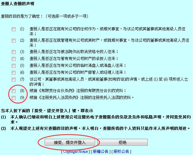 第二步:勾選查冊目的中的(8)(9)項,然后點擊“接受、提交并登入”